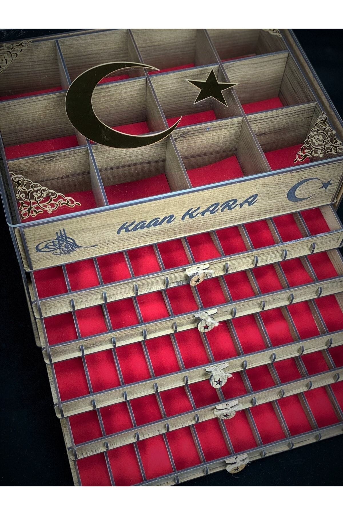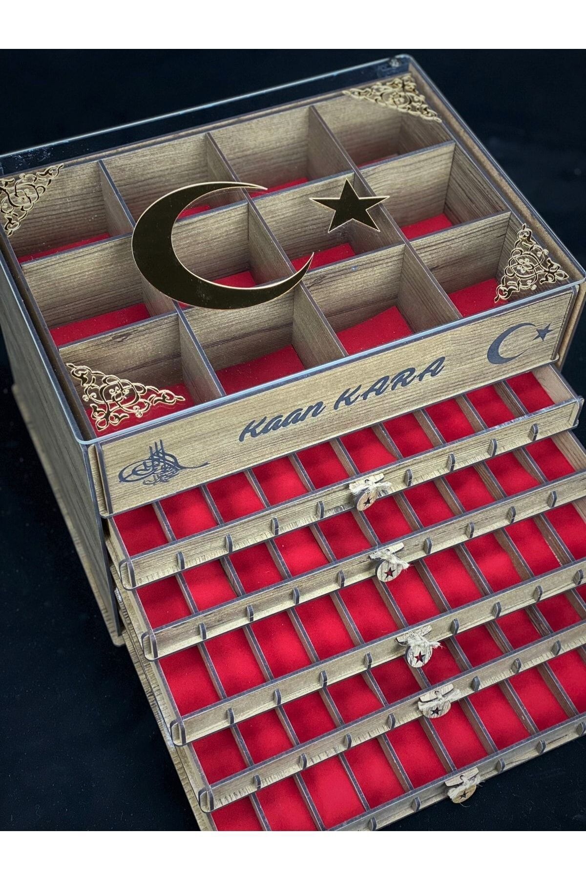 Hammadde Bilgisi: Ürün kasası 3 mm MDF malzemeden üretilmektedir. Ürün kapağı 3 mm şeffaf pleksi (cama göre daha dayanıklı kırılmaz) malzemeden üretilmektedir.Kapak üstü süslemeler 1 mm gold aynalı pleksi malzemeden üretilmektedir. Ürüniçerisindeki çekmecelerde kırmızı kadife kumaş serilidir. ; Teknik Özellikler:Ürün lazer kesim makinası ile kesildikten sonra montajlanmaktadır. ; ÜrünÖzellikleri: Ürün kapağında ay, yıldız, kenar süslemeleri ve isteğe bağlı isimyapıştırılmış şekilde gönderilmektedir. Ürün 50 tesbih ve 12 saat saklamak içinuygundur. ; Ürün Rengi: Kahverengi ; Ürün Ölçüsü: 25x35x23 cm ; Not: Fotoğraftemsilidir. Tesbihler ürünün içine dahil değildir. Satıcıya sor kısmındansorularınızı iletebilirsiniz. ; Ürün üzerine isim yazdırmak isteyenmüşterilerimiz sipariş verdikten sonra sipariş numarası ile birlikteyazılmasını istediğiniz ismi bize satıcıya sor kısmından iletmenizi ricaederiz. ; Müşterilerimizin isteği üzerine satıcıya sor kısmından belirtildiğitaktirde hediye paketi yapılarak gönderilmektedir.